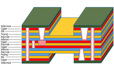 - Hybrid constructions consists of flexible and rigid substrates are laminated together into a single structure and then electrically interconnected using plated through hole.