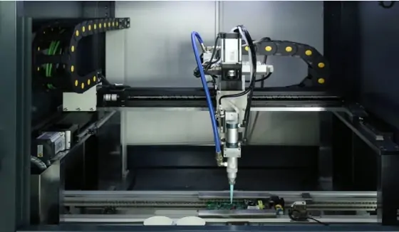 - la x, Y, El sistema de control de movimiento de tres ejes Z realiza con precisión el proceso de dispensación selectiva de varias placas de circuito, evitando áreas que no sean de dispensación, como los conectores. También puede extender con precisión la dispensación a las esquinas de componentes altos en la placa de circuito., lograr acciones de reparación o dispensación de alta dificultad.