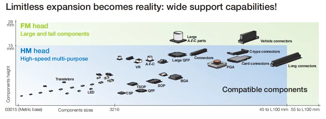 超ワイドレンジタイプのヘッドサップ- ポート強制制御, 幅広いコンポーネントを処理します, 超極小チップから 03015 (mm) 超大型部品まで 55 x 100 mm および最大高さのトールコンポーネント 28 mm.
